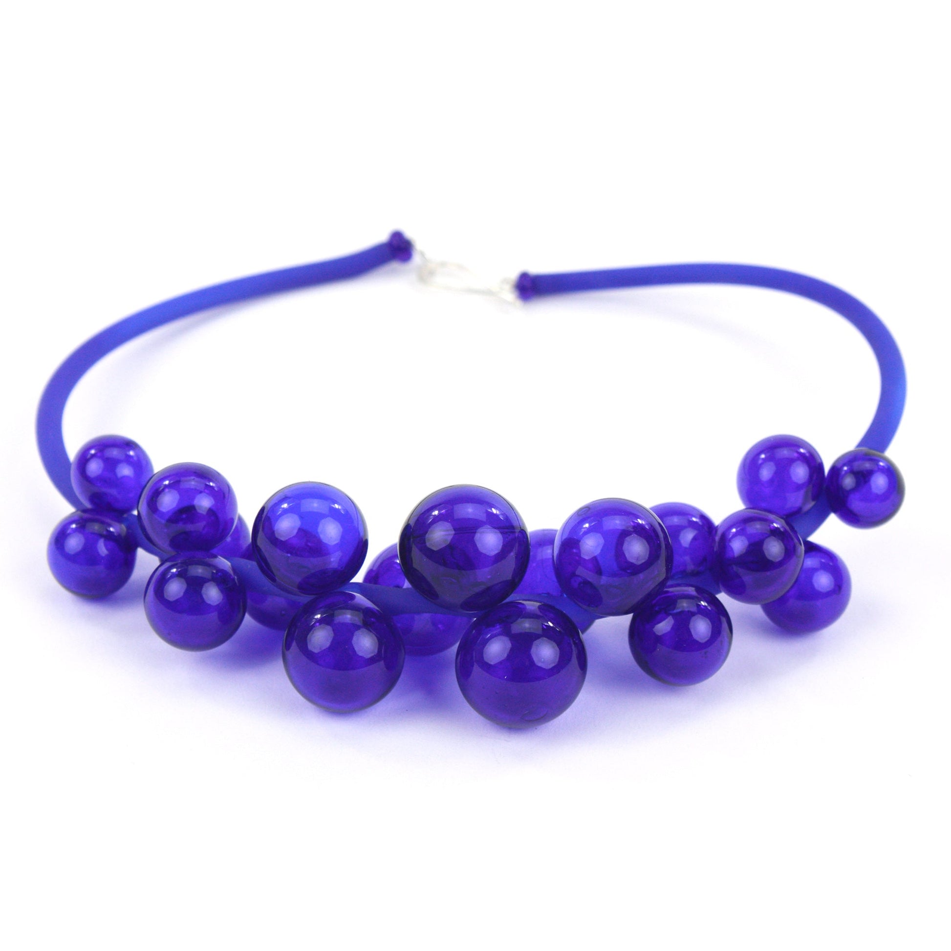 Elevate your style with our exquisite handcrafted glass necklace! This beautiful piece is the epitome of artistry and versatility, showcasing the unique beauty of hand-blown glass bolla beads on a hand-dyed rubber cord.