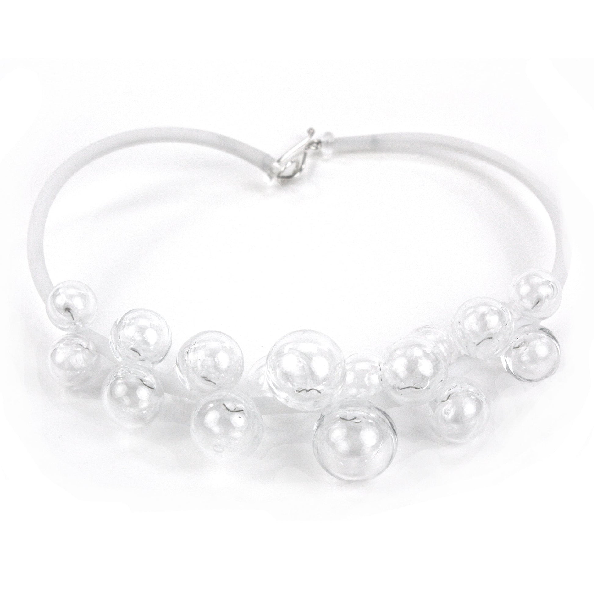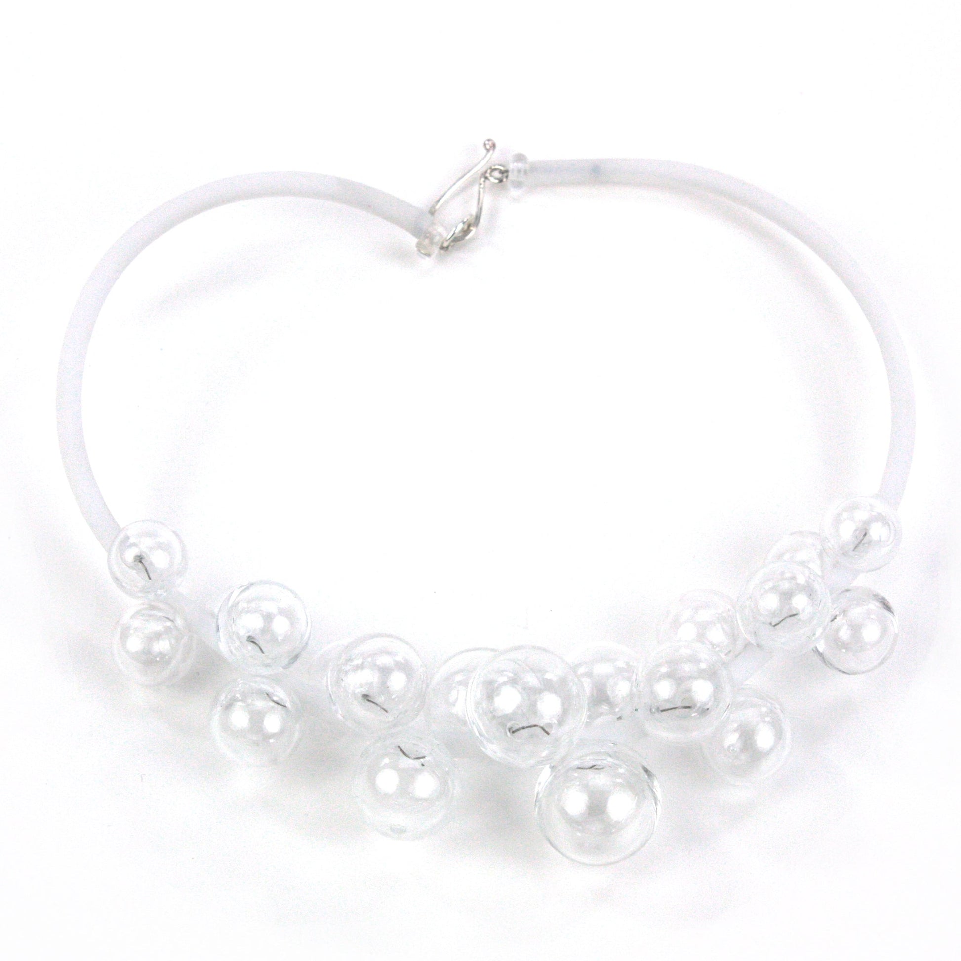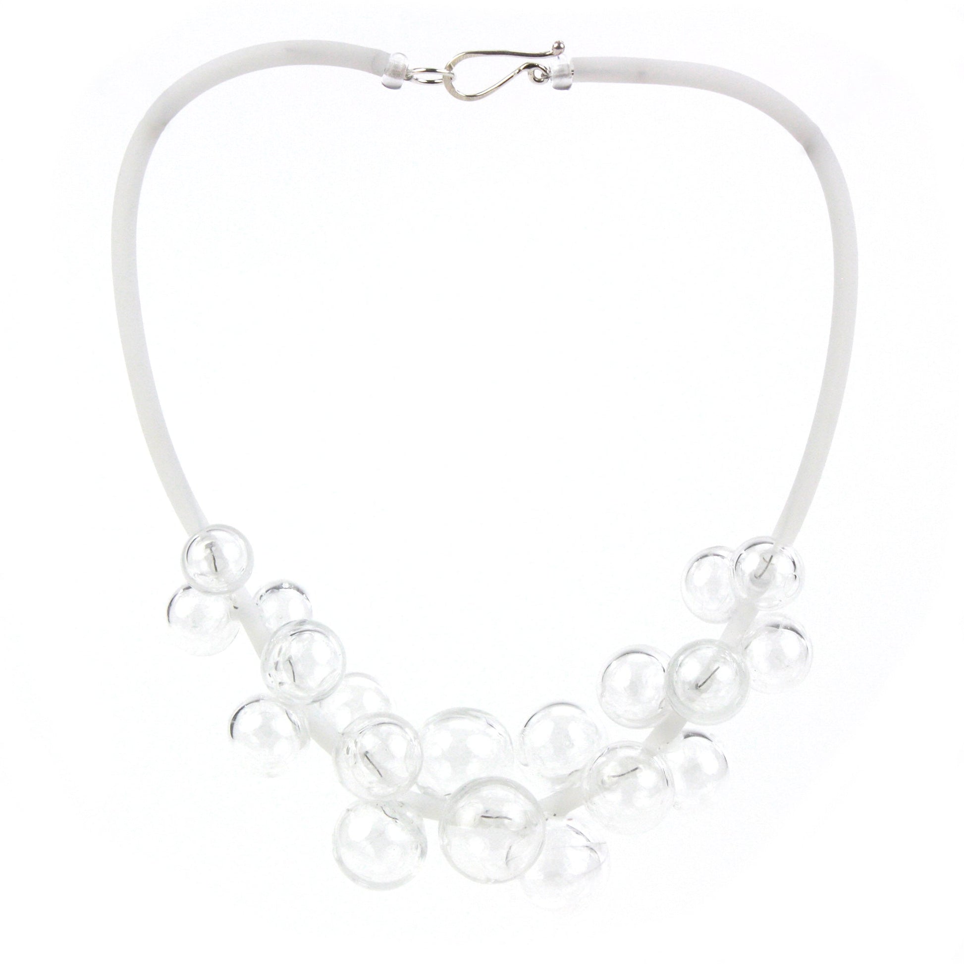 Elevate your style with our exquisite handcrafted glass necklace! This beautiful piece is the epitome of artistry and versatility, showcasing the unique beauty of hand-blown glass bolla beads on a hand-dyed rubber cord.