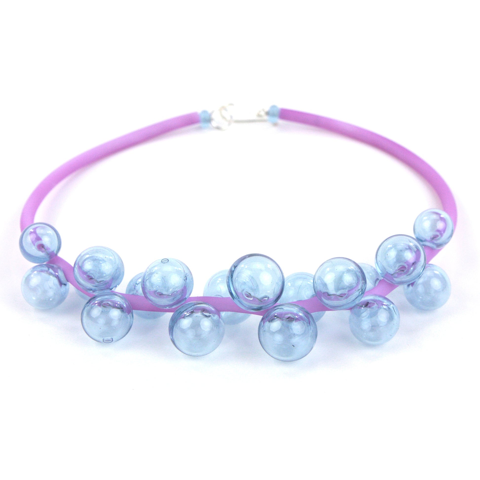 Elevate your style with our exquisite handcrafted glass necklace! This beautiful piece is the epitome of artistry and versatility, showcasing the unique beauty of hand-blown glass bolla beads on a hand-dyed rubber cord.