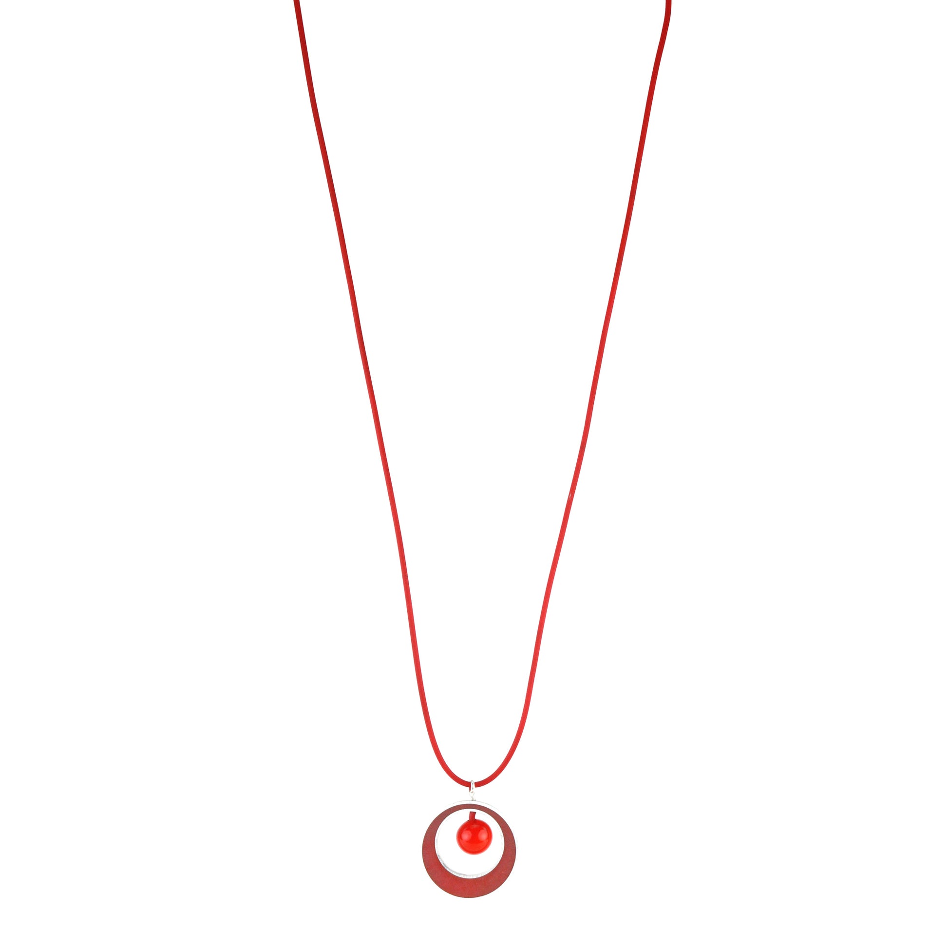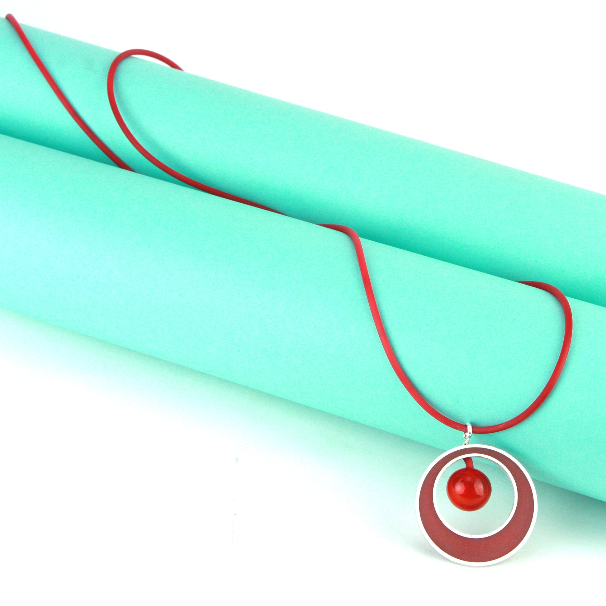 The Glory Necklace in Red is a bold statement of color and craftsmanship, inspired by the glory hole—the furnace opening where molten glass is shaped. This handcrafted pendant features rich red eco-resin, salvaged aluminum, and a glossy blown glass bead, creating a striking balance of texture and luminosity. Suspended on a fully adjustable silicone cord, it seamlessly transitions from 40” to choker length, making it as versatile as it is eye-catching.